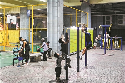 江湾阳光天地架空层的运动广场,市民在运动设施上锻炼。