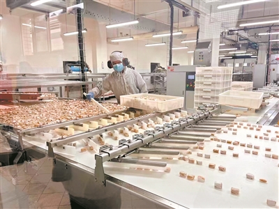 在东莞徐记食品有限公司(以下简称“徐福记”)的智能车间里,糖果在流水线上顺畅滑行;沙琪玛从加入蛋液、发面、揉面到变成面团,成为沙琪玛,都是由自动化机器完成;码垛机器人和物流机器人来回穿梭在一箱箱包装好的糖果、面包之间,犹如一部科幻大片。目前,徐福记共建有4个工厂、39个现代化车间、127条自动化生产线,主要生产糖果、糕点、沙琪玛、巧克力及果冻等休闲食品。