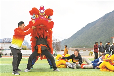 广州北胜蔡李佛传承基地专业教练在教波密县中学的学生舞狮。 广州日报全媒体记者李波 摄