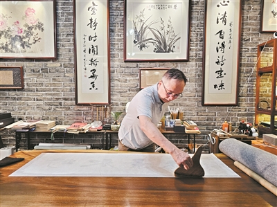 艺良字画装裱工作室的传统字画装裱在2022年获评黄埔区级非遗项目,2023年,黄毅良成为区级非物质文化遗产代表性项目传统字画装裱代表性传承人。今年,这间工作室被认定为区级非遗传承基地,黄毅良多年来参与进校园、进社区等活动,开设书法兴趣班,穿插讲解字画装裱知识,受到不少家长和孩子的欢迎。