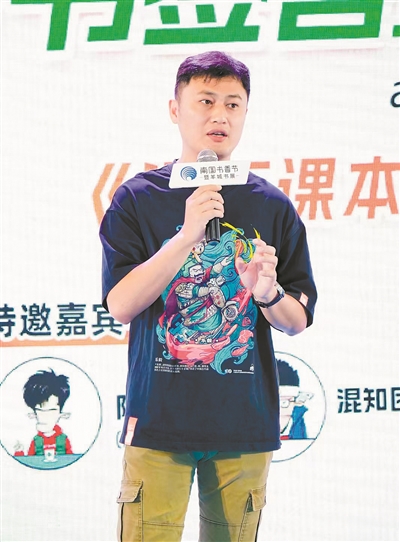 “混子哥”陈磊有多受小朋友喜欢?隔着10米远都能感受到。在展馆里,眼神好的小学生迅速地朝主舞台跑去,那里是陈磊的混知团队的《漫画课本里的数理化》系列新书分享会。