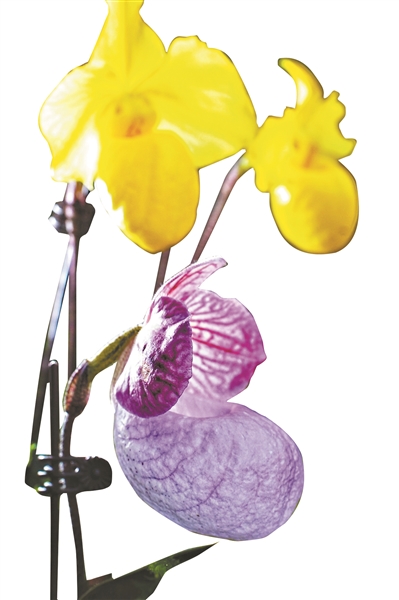兜兰中的金童玉女,其中,黄色为杏黄兜兰,粉色为硬叶兜兰。