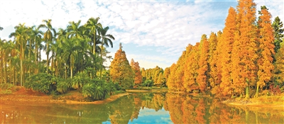 百年前,陈焕镛院士交换得来的落羽杉已成为华南国家植物园冬日的主角。元旦前后,随着冷空气南袭,落羽杉开始“换装”。阳光洒落下,落羽杉叶片变成黄色、红色,如羽毛般随风轻盈飘逸,迎接岁月轮回。游人们穿梭于湖畔的落羽杉林,领略“霜叶红于二月花”,只见水天一色,就像冬日的童话。