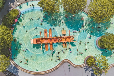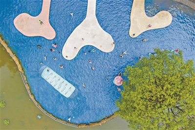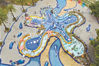 8月9日,小朋友们在儿童乐园体验别样的玩水乐趣。