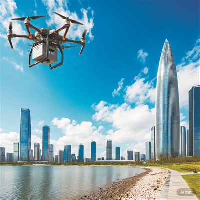 外卖无人机在深圳湾公园上空进行配送。(AI生成图片)