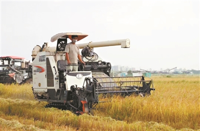 金黄的稻田里呈现出一派繁忙喜悦的丰收景象。
