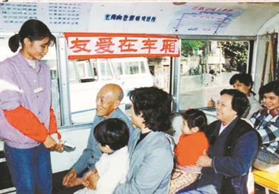 1986年,广州一汽巴士5路车与沿线12个单位联合倡议发起“友爱在车厢”活动。(资料图片)