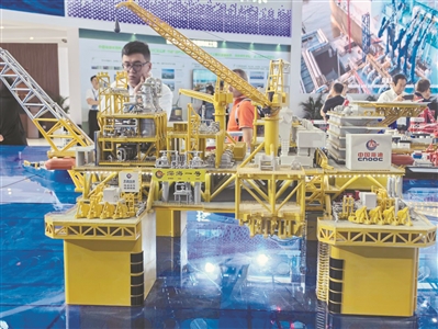 在中国海油展位,最抢眼的莫过于“深海一号能源站”模型。这是我国自主研发建造的、全球首座10万吨级深水半潜式生产储油平台,也是我国首个自营勘探开发的超深水大气田“深海一号”的枢纽。据介绍,“深海一号”能源站总重量超过5万吨,最大投影面积相当于两个标准足球场大小,总高度达120米,相当于40层楼高,最大排水量达11万吨,相当于3艘中型航母。“深海一号能源站”按照“30年不回坞检修”的高质量设计标准建造,设计疲劳寿命达150年,可抵御百年一遇的超强台风,被誉为迄今中国相关领域技术集大成之作。