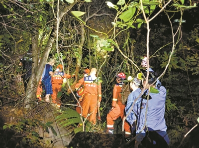 救援人员正在狭窄陡峭的山路上小心翼翼地前进,队员突然发现脚边有一条一米多长的青蛇,拦住了他们的去路。“大家小心!是‘竹叶青’!”此时毒蛇正直立着身体,“嘶嘶”往外吐着信子。因救援人员没有携带捕蛇专业工具,徒手赶蛇十分危险,于是众人只能在狭窄的山路上屏气侧身踱步,小心避开毒蛇后,继续往前披荆斩棘。在山路行进2小时后,21时许,救援人员终于抵达瀑布附近,听到了被困游客的回应。