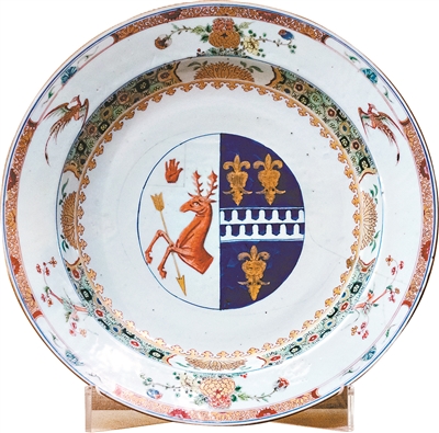 相较于华丽的洛克菲勒广彩瓷,旁边的徽章瓷显得有些低调,其背景却并不简单。“徽章瓷是按照外商提供的特殊标识图案和要求专门定制的瓷器,器物上绘有皇家贵族、商旅军团等徽章标志纹饰,每件徽章瓷器的背后都蕴含着徽章主人的故事。”谭广辉说,徽章瓷的诞生让广彩出口销量取得了重大突破,成为我国清代三大外销瓷器之首。