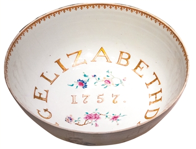 走进广州十三行博物馆,一楼展厅正中央的位置摆放着一件广彩瓷器——“广彩洋人远航图大碗”。碗内中心写着航海年份标识“1757”,周边环绕着一圈英文字母“DARLING ELIZABETH”(意为“亲爱的伊丽莎白”)。