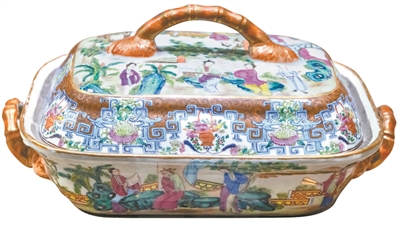 来到十三行博物馆二楼展厅,在一处名为“洛克菲勒广彩瓷”的展柜前,谭广辉解释说,广彩又称“广州织金彩瓷”,其最特殊的工艺在于“织金堆玉”,即在洁白如玉的胎瓷上,用提花织物般的手法,将金色“织”在瓷器上,烘托彩绘图案。“‘织金’的特点在洛克菲勒广彩瓷上体现得最为明显。”谭广辉告诉访学团,洛克菲勒广彩瓷把广彩艺术推向了高峰,它的边饰大范围织金,配以小开窗;中心图案多为中式庭院人物纹,配以少量山水纹、花卉纹。整体织彩鎏金、富丽堂皇,在当时被称作“王室瓷”。