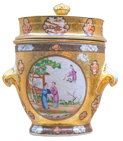 清嘉庆广彩锦地描金人物纹双耳盖盅