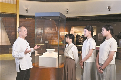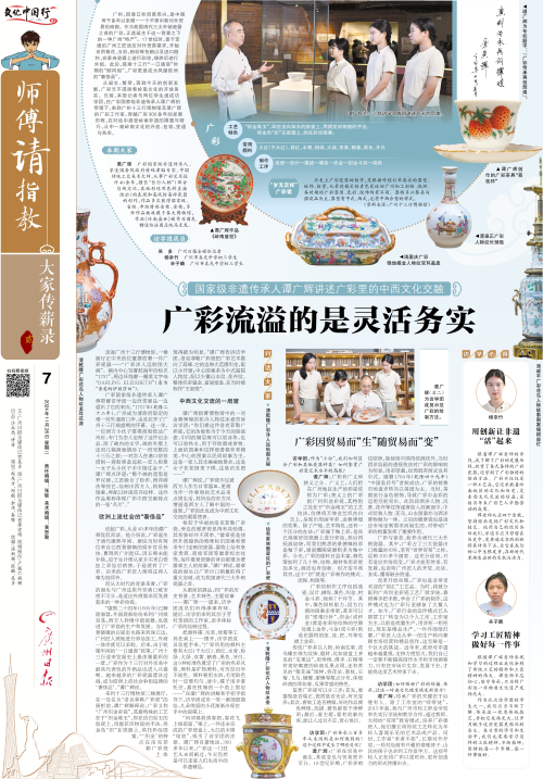 从诞生、繁荣,再到今天的创新发展,广彩无不浸润着岭南文化的开放务实。日前,本报记者与两位学生组成访学团,在广彩国家级非遗传承人谭广辉的带领下,来到广州十三行博物馆及谭广辉的广彩工作室,穿越广彩300多年的发展历程,在对话中感受岭南非遗的厚重与精巧,从中一窥岭南文化的开放、包容、变通与务实。