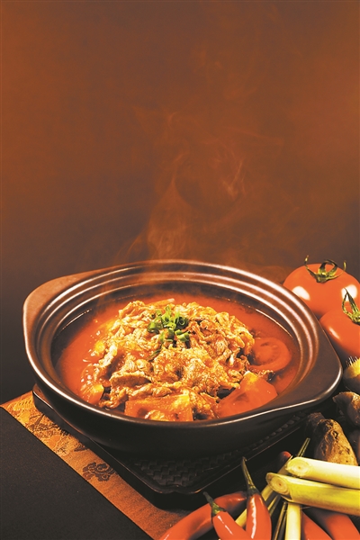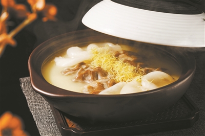酸汤,则带来另类的“清爽”。来自贵州的凯里红酸汤近年来颇受大众喜爱,其酸甜可口的味道,瞬间能将胃口大开。广州酒家厨师今冬为美食爱好者带来“苗家红酸汤肥牛”,来自贵州凯里的红酸汤制作工艺,再加上粤菜工匠大师融合创新的烹饪技巧,让这道贵州菜有了全新的演绎。厨房自制的浓鲜高汤和肥牛丰富的蛋白质很好地中和了红酸汤的酸味,让本应浓烈的果酸味变得醇厚柔和,恰到好处又富有层次。沸腾的酸汤底汤色鲜艳,肥牛吸收了浓郁的汤汁,简直是视觉味觉的双重享受。