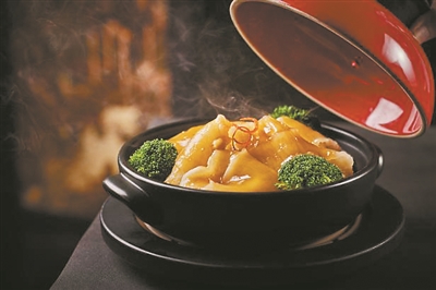 东方宾馆宴乐宫在近日的“冬·暖”应季滋补菜系中,亦有煲仔菜——鲍汁腰豆花胶掌亦煲,乃甄选纯正优质的高级花胶,洗净泡发入馔。搭配富含胶原蛋白的鹅掌亦,沥干水分放入热油中,待炸至鹅掌外皮金黄和起酥后迅速捞起入煲,融入高汤和秘制鲍汁,将食材浸润在汤底中吸饱汤汁,小火慢炖至汤汁浓稠,味道醇厚,鹅掌亦炖煮后口感糯滑,香味四溢。最后佐以新鲜红腰豆焖制收尾,呈现出口感丰富的“鲍汁腰豆花胶掌亦煲”。