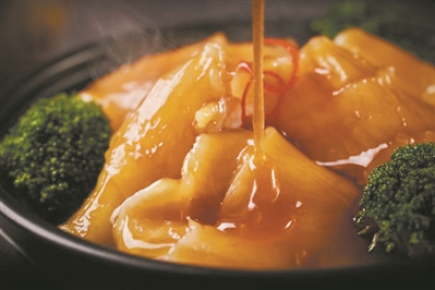 而风栗鲍鱼果园鸡,是选用放养为主的果园鸡,皮脆肉滑,配搭鲍鱼的细嫩肉质,散发鲜美的海味,与栗子的甜香结合,增加了口感的层次。
