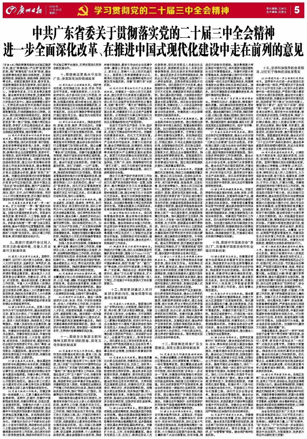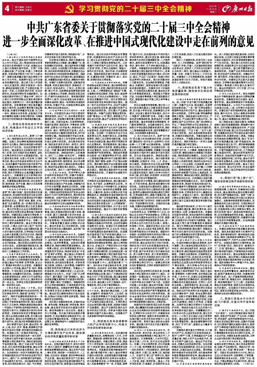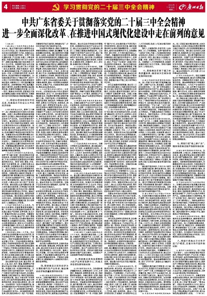 中共广东省委关于贯彻落实党的二十届三中全会精神进一步全面深化改革、在推进中国式现代化建设中走在前列的意见