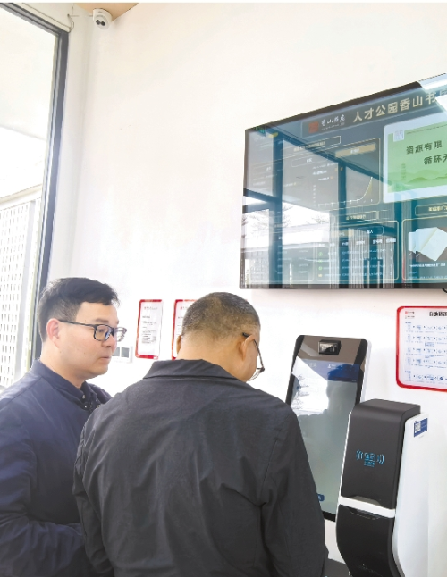 走进中山人才公园香山书房,映入眼帘的便是香山书房借还办证自助机、人才公园香山书房实时数据显示大屏等智能化设备,广大市民在此可“一站式”享受全市“通借通还”借还书和办证服务,一手掌握香山书房客流量、馆藏量、借阅情况等内容。书房内目前已设置两处大型书柜,馆藏丰富,已有5000本图书“入驻”,涵盖哲学、经济、文化、艺术、工业技术、自然科学等13个类别,未来将持续更新轮换和补充。