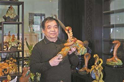 黄志伟今年不但创作了《高瞻远瞩》与《百业兴旺》两款蛇年生肖陶瓷公仔,还推出十二生肖主题的创意茶具。“石湾陶瓷最初多是生活日用的器皿,这套十二生肖主题茶具,采用雕塑技法,釉色方面运用窑变效果,入窑一色出窑万彩,每个人用自己的生肖杯子,就很容易区分。把石湾陶瓷艺术用在实用的生活器皿上,也算回归初心。”黄志伟说。