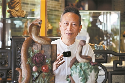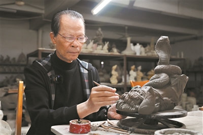 在刘胜记第五代传人、正高级工艺美术师刘兆津看来,蛇是幸运与吉祥的象征。今年他的作品是《祥蛇祝福》,一条灵蛇盘踞在节节高升的竹子上,与破土而出的春笋共同迎接新岁的到来。