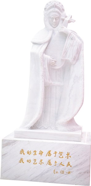 此次揭幕的红线女雕像高2.8米,重2吨,特邀著名雕塑家黎明以汉白玉材质雕刻而成,展现了红线女在《昭君出塞》中饰演的王昭君的经典形象。雕像下方基座刻有“我的生命属于艺术 我的艺术属于人民”的金色大字,彰显了红线女一生践行的艺术理念。