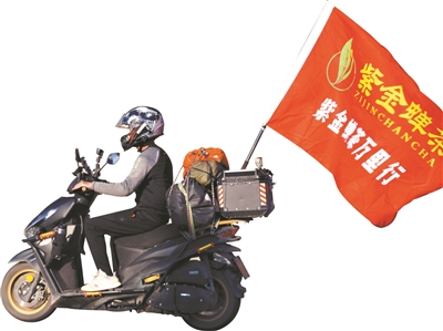 印有“紫金蝉茶万里行”的宣传旗,在途中十分醒目。