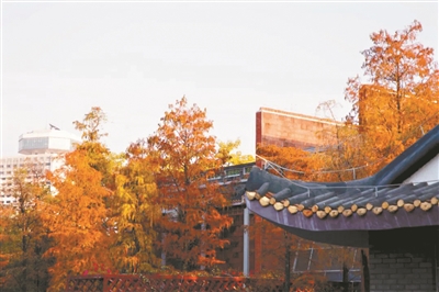 从可园北路出发,步行10分钟左右便到达可园博物馆北门,映入眼帘的是一棵棵笔直挺拔的落羽杉。它们矗立在博物馆两旁呈现出不同程度的色彩——橘黄色、棕红色、浅绿色交织在一起,在冬日暖阳的照耀下,更加艳丽动人。