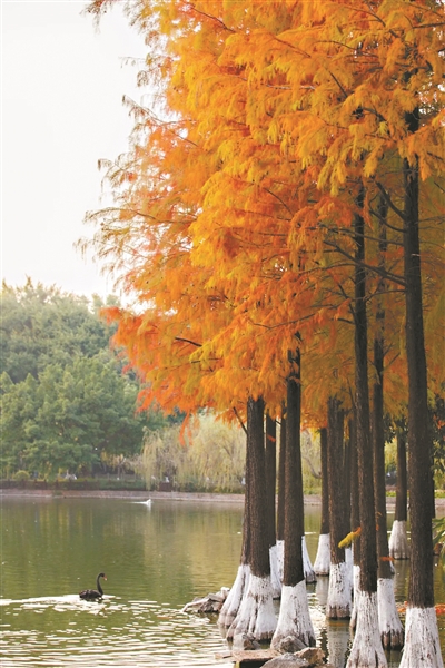 穿过可园广场一路向南便来到湖边,这里渐渐变红的落羽杉叶与周边葱郁树木互相衬托,高低掩映,编织成一幅幅红绿锦缎,令市民和游客流连忘返,大家纷纷拍照记录下落羽杉的惊艳时刻。