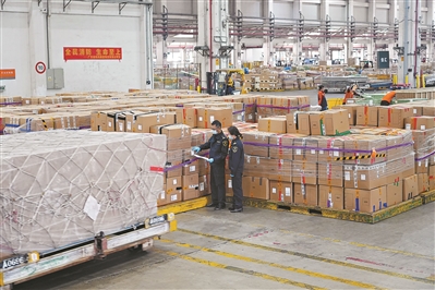广州海关所属广州白云机场海关关员对进出口货物开展巡仓监管。