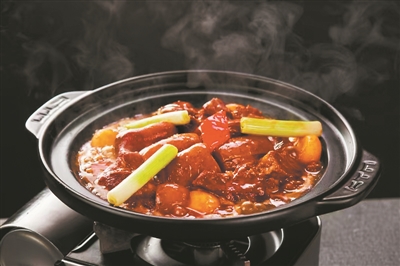 而店中的“秘制羊腩煲”,则为街坊之所爱,由总厨卢镜泉在多年前研制而成,他选用新鲜的羊肉,经过焦糖熏制,去除膻味之余,令羊皮呈现出诱人的色泽。在烹饪过程中,先将羊肉与香料一同炒制,以增强香气并进一步消除膻味。随后,加入花雕酒和特制酱料,底部铺上腐竹、萝卜和马蹄,提升整体风味。