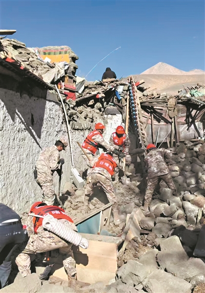 1月7日,西藏日喀则市定日县发生6.8级地震,截至当天19时,已造成126人遇难、188人受伤,各级救援力量已赶赴震区开展救援工作。图为救援人员在定日县长所乡搜救。 新华社发