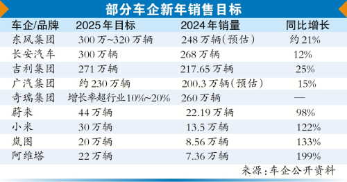 今年,“创新高”成为诸多车企的年度目标关键词。广汽集团在1月1日的新年贺词中提到,今年将全力挑战实现年度销量增长15%的经营目标;吉利汽车提出了2025年实现271万辆的全年销量目标,同比增长24%左右……截至目前,共有近20家车企或品牌已经对外公布了2025年的全年销量新目标,关键词可总结为“创新高”。尤其相比大的汽车集团与合资品牌,新势力的目标更为激进,如小米、阿维塔、岚图、深蓝汽车的年度目标普遍同比翻倍。如2024年全年交付13.5万辆的小米汽车,2025年的交付目标大幅提升至30万辆,增幅为122%。