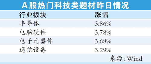 热门科技类题材全线爆发,半导体板块集体走强。Wind数据显示,截至收盘,半导体、电脑硬件、电子元器件行业指数涨幅均超过3.5%。