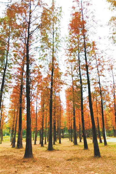 据介绍,鹤山公园的落羽杉林始种于2013年,全园共有500多棵,总面积3000多平方米。落羽杉的树叶入冬后转为艳红,非常迷人。目前,落羽杉迎来最佳观赏季,吸引各地的游客纷纷前来打卡、游玩。