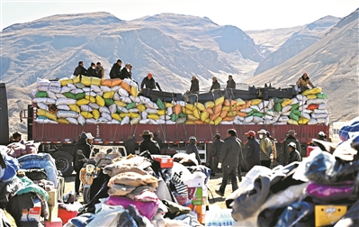 昨日,受灾群众在日喀则市拉孜县拉孜镇措布村卸载救灾物资。 新华社发