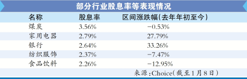 Choice数据显示,按申万一级行业指数分类,截至1月8日,股息率排在前三的行业是煤炭、家用电器和银行,股息率分别为3.56%、2.79%和2.64%。从去年年初至今,股息率较高的银行、家用电器、通信等行业区间涨幅均超20%。