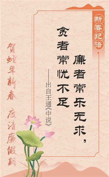 先贤教诲记心间。越是新春假期,我们越要紧绷廉洁自律这根弦,尤其广大党员干部在春节期间更要守好“廉洁关”,严守党规党纪,在守廉践廉中度过祥和欢乐的蛇年春节。