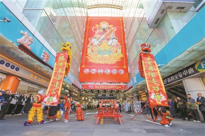 伴随着锣鼓节奏,醒狮上高桩、采青,双龙飞舞……一招一式吸引着商户和市民的眼球。醒狮点睛仪式举行后,广州国际轻纺城正式迎来新春开市。