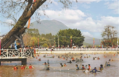 每年春节,河源市东源县漳溪畲族乡中联村都会上演一场别开生面的捕鱼盛会。