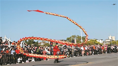备受关注的非遗巡游展演在昨天下午举行,由25个巡游方阵、近1300人组成的巡演队伍,从包公文化园出发,载歌载舞、一路前行,沿途经过肇庆古城的主要街道,最终到达阅江楼,路线全程4.4公里,步行时间约120分钟。