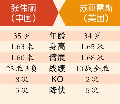 虽然久疏战阵,但苏亚雷斯此前保持不败,因此外界赛前把她看作张伟丽的“最强对手”。苏亚雷斯身高和臂展比张伟丽略有优势,而且擅长摔柔技术,赛前她表示要在比赛中“绞晕”张伟丽。张伟丽则自信满满地认为,自己只要正常发挥技战术就能击败对手。
