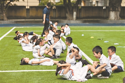 根据新规调整课间时长后,广州协和学校小学部将班队活动和道法课时长调整为20分钟,增加一节体育活动课。一、二年级每天一节体育课,三至六年级每周四节体育课。初中部增加一节课后体育活动。该校还结合引入第三方机构的各类体育兴趣班,保障学生每天在校的体育活动时间。