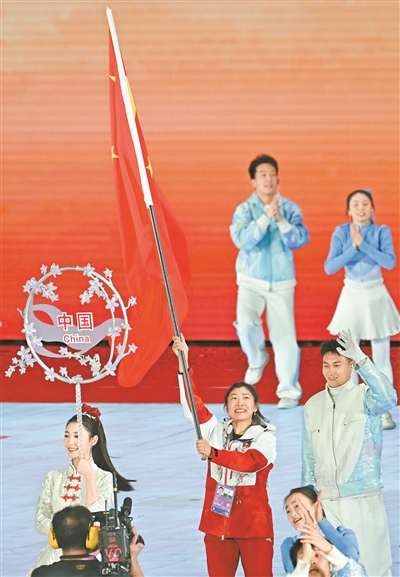 昨日,中国体育代表团在亚冬会闭幕式入场。新华社发