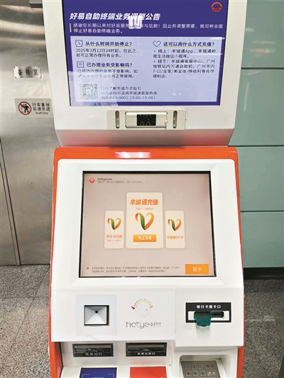 广州日报讯 (全媒体记者卢梦谦摄影报道)昨日,广州好易电子联行服务有限公司发布关于好易自助终端业务调整公告。其中提到,因业务调整需要,将于2025年3月12日24时起,全面停止好易自助终端业务。已办理的业务(如学生卡申办等)将继续正常使用,不受本次调整影响。好易自助终端中包括羊城通充值服务,在业务停止后,市民可通过其他渠道办理羊城通卡余额查询和充值等相关业务。其中,线下渠道包括羊城通客服中心以及羊城通合作网。