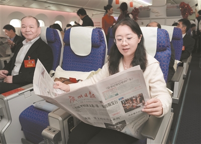 全国政协委员周清在赴京航班上阅读当天的《广州日报》。