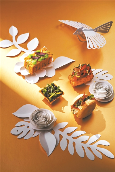 在广州富力丽思卡尔顿酒店的珍珠酒廊里,有一款迷你烤蔬菜塔。梁俊彪师傅选用香草炒的意大利青节瓜和黄节瓜,清爽可口。搭配上黑橄榄制作的橄榄酱和罗勒酱,口感丰富。虽是一道素食,却能让人眼前一亮。炒香的虾仁搭配上塔塔酱搅拌均匀,用番茄面包坯包裹,口感丰富;绿色的牛油果酱点缀其中,飘香十足。还有辣味金枪鱼炸寿司饭团,金枪鱼,切细粒用少许酱油和青芥末搅拌均匀,用寿司米饭压制成大小一致的饭团,裹上一层米粉,油炸上色。最后制作成塔形,在金枪鱼上点缀粒粒脆野米,造型精致,脆糯可口。5J火腿山羊芝士马卡龙,把蛋白粉、糖粉、昆布木鱼花熬制的水、酱油混合在一起打发,挤成模样精致的马卡龙大小烤至干,搭配羊奶芝士、5J火腿薄片并加入芝麻菜,表面撒上些番茄粉点缀,色彩丰富。