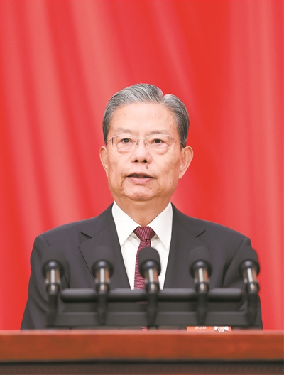3月8日,十四届全国人大三次会议在北京人民大会堂举行第二次全体会议。受全国人大常委会委托,赵乐际委员长向大会报告全国人大常委会工作。         新华社发