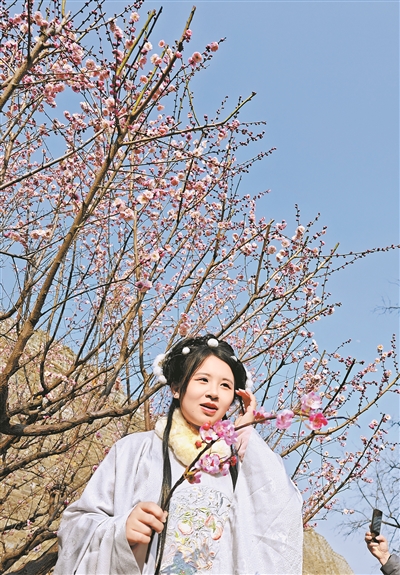 北京明城墙遗址公园的梅花吸引市民拍照打卡。