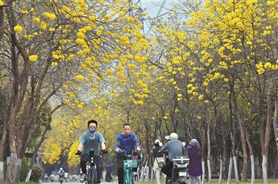 广州临江大道繁花似锦,绿道两侧盛开的黄花风铃木惹人心醉。